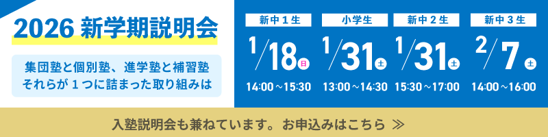 ようこそ!! “君の勉強部屋”へ この瞬間を大切に 将来の夢 実現へ “少人数限定塾”だからできること。 私たちが教えられる塾生数は限りがありますが、 塾生の可能性は無限大です。 ”冬期講習会2025”デジタルパンフレット Instagramで教室の様子をチェック 新着情報 情報一覧 過去の情報一覧